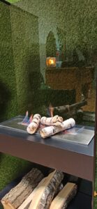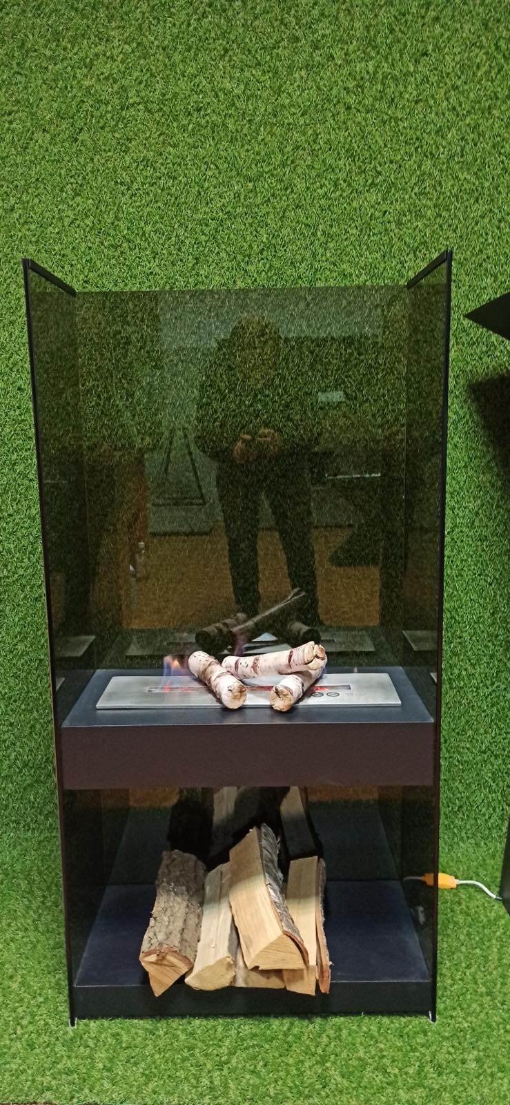 • Контраст матеріалів: Поєднання прозорого бронзового скла, міцного металевого пальника та натуральних дров створює захоплюючий візуальний контраст, підкреслюючи унікальність та високу якість виробу.